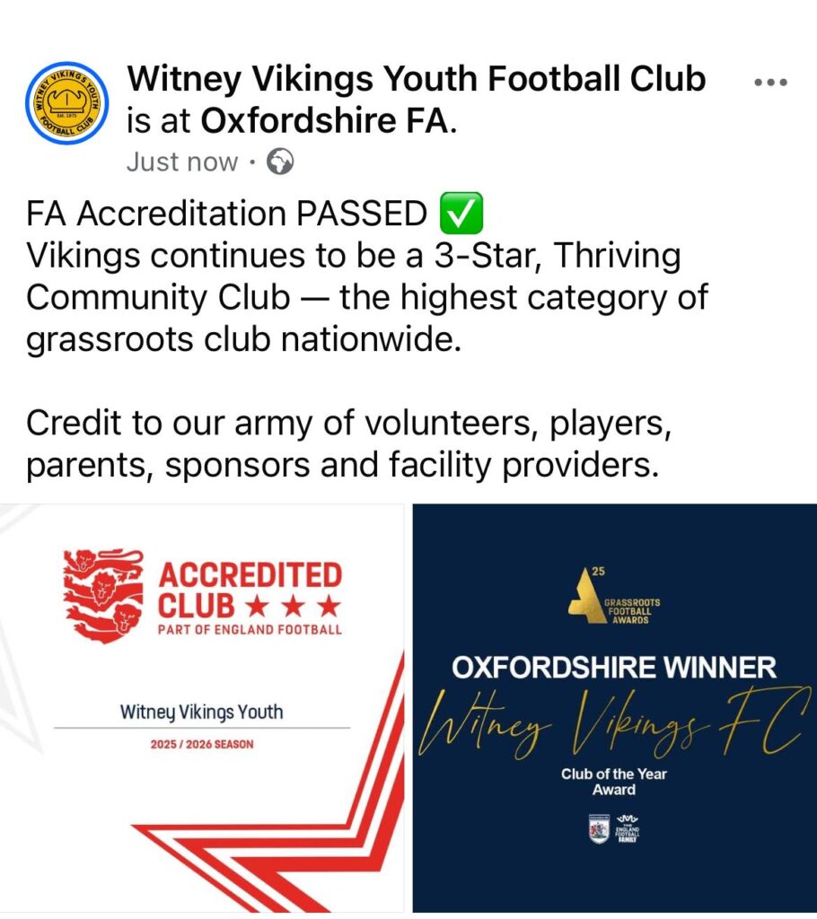 Congratulations to everyone involved in ensuring that Witney Vikings continues to be a 3-Star, thriving, Community Club – the highest category a grassroots club can achieve nationwide.